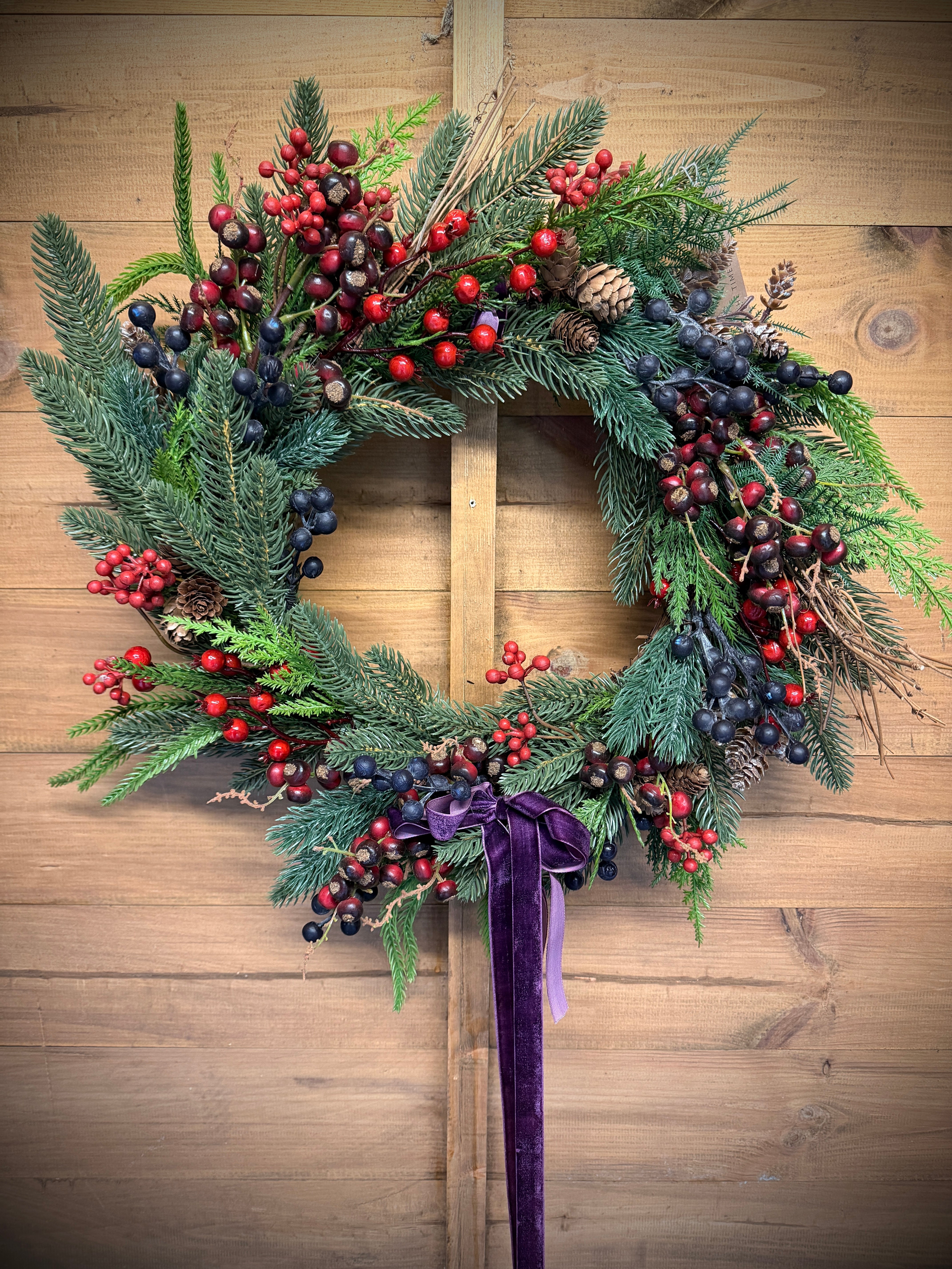 Berries nestled among an abundance of faux foliage—including spruce, pine, eucalyptus, and ferns—add that Christmas cheer